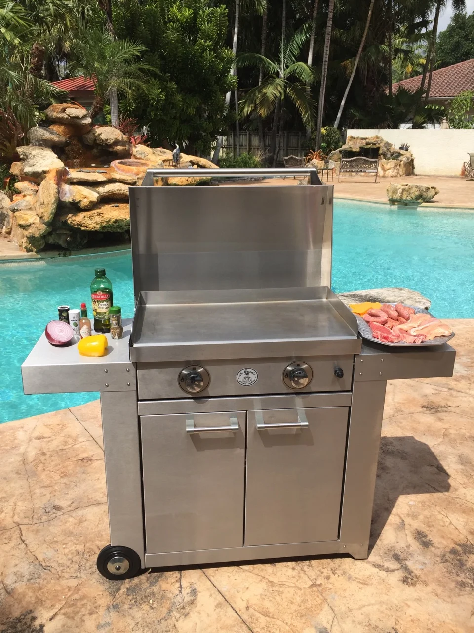 Le griddle extérieur moyen contient une plaque de cuisson amovible pour faciliter le nettoyage du châssis INOX. Il possède un grille coupe-vent sur le châssis pour éviter que les brûleurs s’éteignent quelles que soient les conditions climatiques. Faible consommation d'énergie pour un fonctionnement continu et sécurité accrue avec Thermocouple pour éviter toute fuite de gaz. Allumage des brûleurs avec Piezzo électronique.